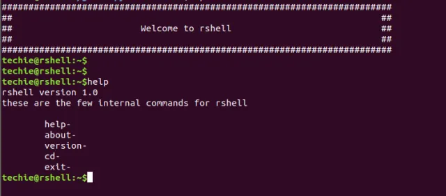 Below is the source code to generate a shell name as rshell which supports a few commands like “help”, “exit”, “about”, “version” and “cd”.