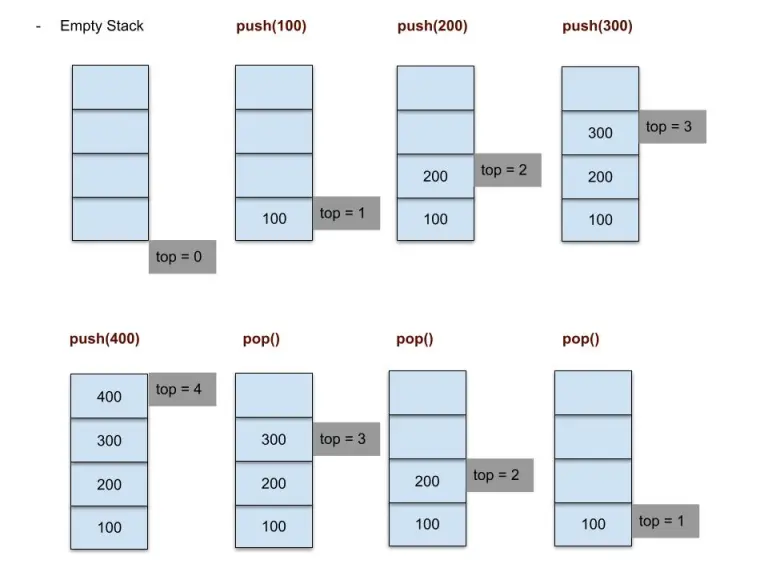 Stack data structure enables you to use LIFO [ Last IN first OUT ] approach. Whatever data comes first goes last. It also called FILO [ First IN Last OUT ]. For I/O, it provides you two functions.